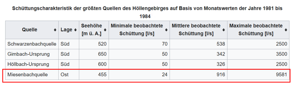 Für uns sind durch den Betrieb des Bruthauses in der Miesen Bach Mühle der Miesen Bach- und die Schusterbachquelle von Interesse. Auch wird es in den nächsten Jahren wichtig sein, die Wasserführung (Schüttung) zu verfolgen. Jedenfalls haben die hydrochemischen Beprobungen bei der Miesenbach- und der Schusterbachquelle für die Forscher interessante Ergebnisse gebracht. Die beiden Quellen fielen aufgrund ihrer vergleichsweise hohen Chlorid- und Natrium-Werte auf, welche auf das Vorkommen von Evaporiten im Einzugsgebiet hinweisen. Da bei diesen beiden eng benachbarten Quellen die Schüttung und der Lösungsinhalt in gleicher Weise auf die Niederschlagsverhältnisse reagieren, wird daraus geschlossen, dass die Schusterbachquelle einen zum System der Miesen Bach Quelle gehörenden Überlauf darstellt.