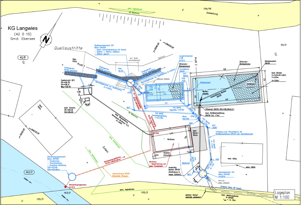 Hierfür ist die Errichtung eines neuen Notversorgungsschachts mit Stromversorgung auf dem Grundstück Nr. 40/8 im Bereich des Schusterbaches vorgesehen. Vom Schacht aus wird eine Druckleitung aus PE-Rohr (DA 63) bis zum Quellsammelschacht QF1 verlegt. Diese Leitung wird im Bedarfsfall in Betrieb genommen, um die Versorgung der Anlage sicherzustellen.