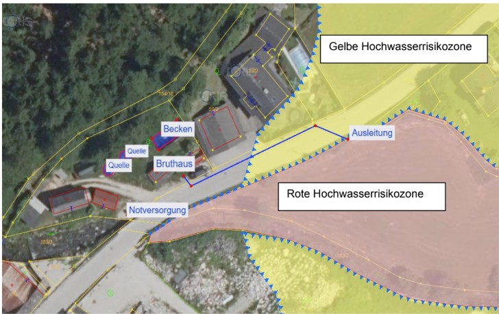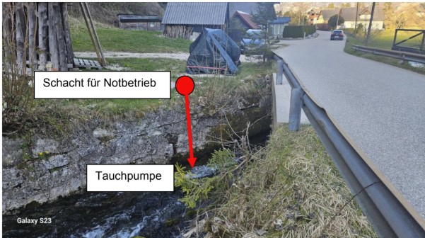 Zusätzlich ist die Errichtung einer Notwasserversorgung mittels Tauchpumpe im Bereich des Miesenbaches vorgesehen. Diese soll im Falle einer unzureichenden Wasserzufuhr oder beim temporären Trockenfallen der Quelle aktiviert werden, um die kontinuierliche Dotation der Durchflussanlage sicherzustellen.