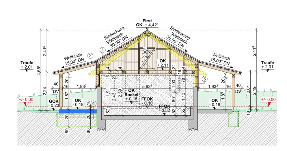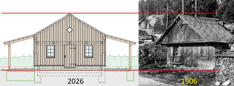 Der bestehende Holzaufbau inklusive Dach des Bruthauses wird vollständig zurück gebaut. Die vorhandenen Fundamente sowie die gemauerte Basis bleiben erhalten. Anschließend erfolgt der Wiederaufbau in moderner Holzleichtbauweise mit einer neuen Dachkonstruktion und zeitgemäßer Dacheindeckung.