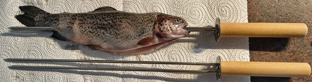 Fische über dem (Lager)-Feuer zu grillen ist eine der ursprünglichsten und schönsten Grillarten. Die einfachste Vorgehensweise ist es, den Fisch auf einen zugespitzten Ast oder Holzstab zu spießen um ihn dann über das Feuer zu halten bzw. zu legen.