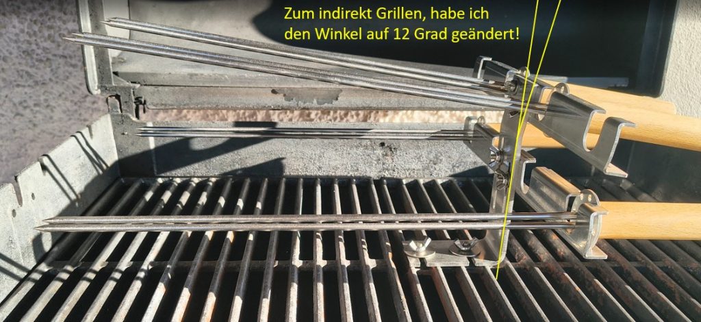 Daher habe ich die Stellung im Schraubstock auf ca. 12 Grad verringert und damit eine flachere Spießausrichtung. Mit dieser kleinen Änderung lässt sich der Deckel schließen, auch wenn die Spieße im oberen Spießhalter eingelegt sind und man bekommt optimale Grill Ergebnisse über die indirekte Grillmethode.