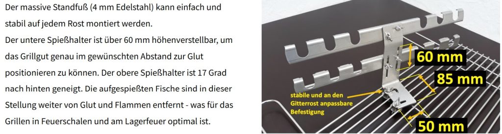 Die Spieße liegen – frei per Hand drehbar – in den sogenannten Spießhaltern. Der untere Spießhalter ist ohne Werkzeug am Stand Fuß höhenverstellbar ist. Mit diesem speziellen „Spießsystem“ haben ich die Kontrolle und die Sicherheit, die für einen wirklich gelungenen Steckerlfisch notwendig sind.
