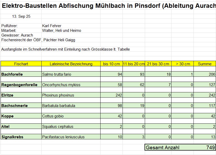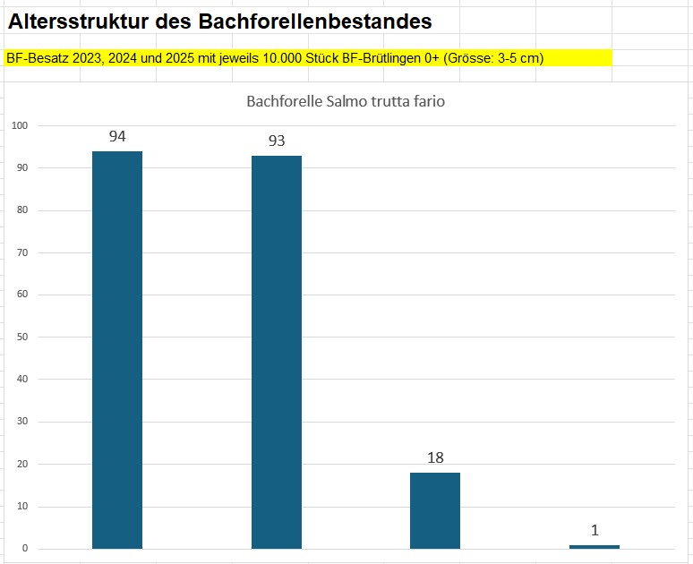 Der Druck, hohe Pachtpreise zu rechtfertigen, führt oft dazu, dass wirtschaftliche Interessen Vorrang vor ökologischer Weitsicht haben. Die Aurach wird von einem Bewirtschafter betreut, der mit der erforderlichen ökologischer Weitsicht agiert und der Erfolg, wenn man sich die Alterspyramide der Bachforelle betrachtet, recht gibt. Der Brütling-Besatz aus dem Jahr2023, wird heuer zum ersten mal selbständig ablaichen und dadurch sind weitere Besatzmaßnahmen hinfällig. Die Eigenreproduktion der Bachforellen werden wir in den nächsten Jahren kontrollieren und dadurch auch die Maßnahme kontrollieren.