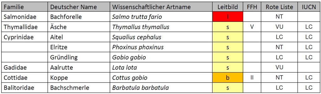 Das Vorkommen der Elritze (Phoxinus phoxinus) und Bachforelle (Salmo trutta fario), insbesondere in größerer Zahl, gilt als ein Indikator für eine gute Gewässerqualität. Die Elritze kann und soll dabei sogar der am häufigsten vorkommende Fisch sein, wie wir auch bei der Befischung feststellen konnten.