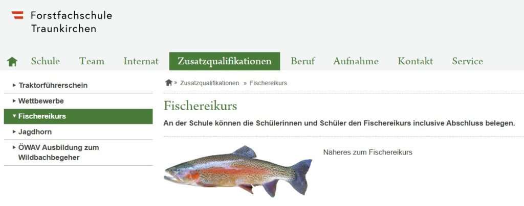 Für die Teilnehmer der Forstfachschule steh ja zumeist nicht das „Fischen“ im Vordergrund. Jedoch als Forstwart sind sie laut § 104 Abs. 2 des Forstgesetzes behördliche Forstorgane und berechtigt Betriebe bis zu 1.000 ha jagdlich und forstlich zu führen. In diesen Umfeld wird so mancher Abgänger aus Traunkirchen, auch Gewässer in seiner Obhut haben und auch Fischteiche.