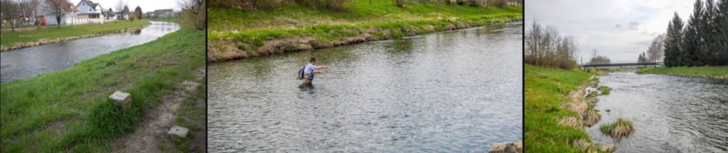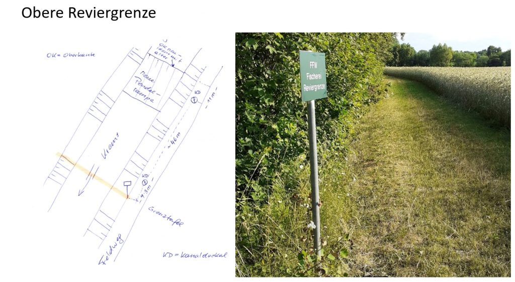 Die genauen Grenzen unseres Fischereireviers sind exakt ermittelt worden und mit dem „oberliegenden Fischereirechtsinhaber“ in einer gemeinsam Begehung fixiert worden. Mit dem unterliegenden Revier war die Reviergrenze durch einen alten „Markstein“ am linken Ufer exakt erkennbar.