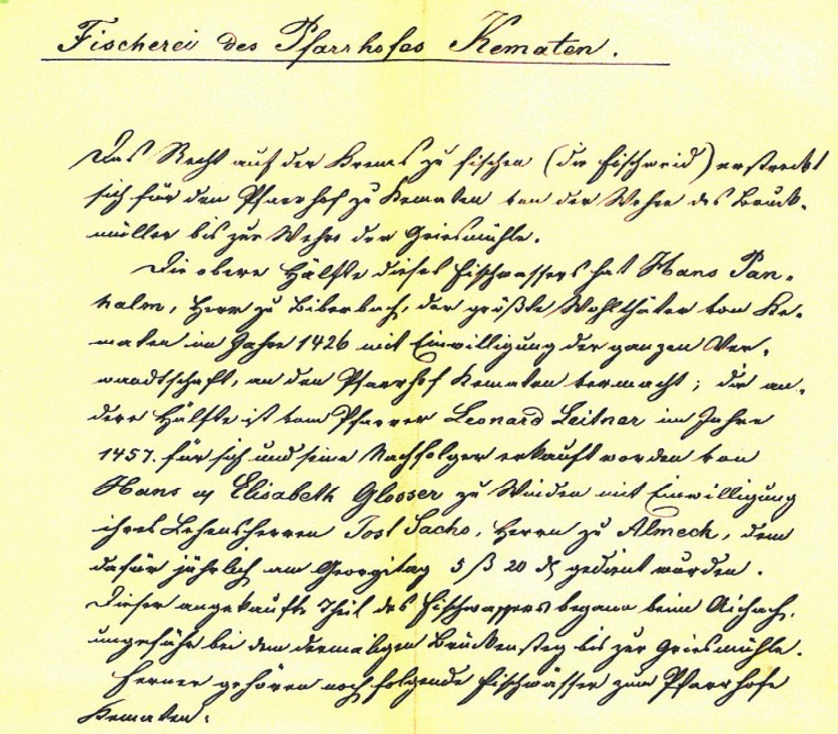 Der Besitzbogen aus dem Jahr 1819 zeigt die lange Geschichte der Fischereirechte in Oberösterreich auf.Wobei die Fischerei und deren Rechte bis ins Jahr 1457 und davor reichen….. Bei den kirchlichen Besitztümern gibt es zumeist auch noch eine recht gute Dokumentation, soweit man in der Lage ist, die handschriftliche Kurrentschrift zu lesen.