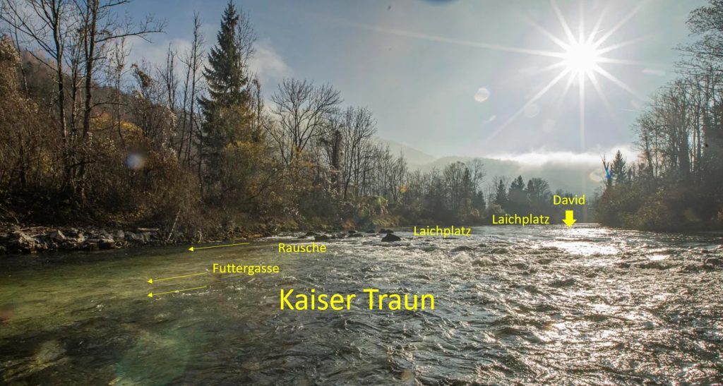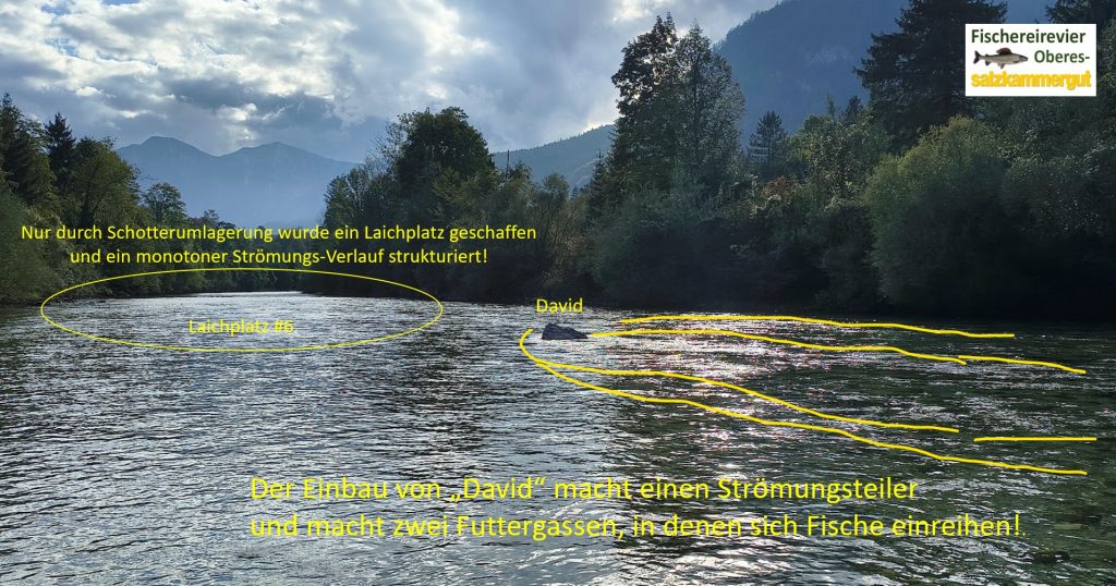 „David“ ist das Pseudonym für einen Stein, einen Strukturstein in der „Kaiser Traun„, einen großen Findling. Dieser Stein wurde bei einem Laichplatzverbesserungs-Projekt an der Oberen Traun vom Baggerfahre „David“ freigelegt und auch der ÖBF-Projektleiter für die Laichplatzverbesserung, heißt mit Vornamen „David„, was liegt daher näher als diese neue Klein-Gewässerstruktur auch den Namen „David“ zu geben.