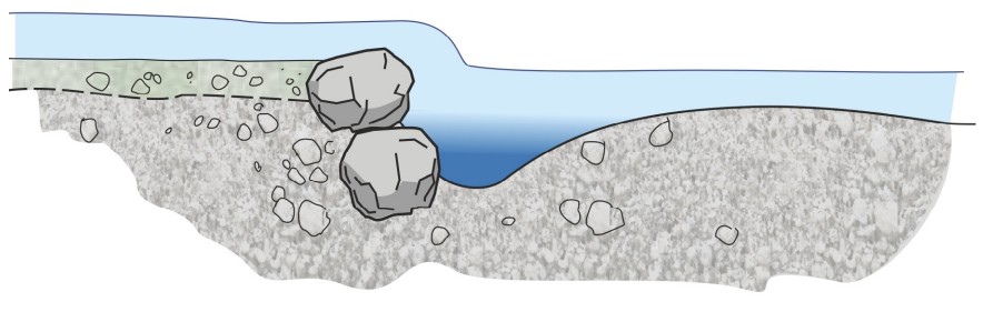 Bei Niederwasser nur teilweise überströmte Struktur, die in der Regel über die ganze Gewässerbreite reicht. Die Korngrößenverteilung sollte so hergerichtet werden, dass sich oberhalb ein Laichplatz bildet und die nachfolgenden groben Fraktionen sollten auch bei einem Hochwasser nicht weitertransportiert werden. Gewisse Setzungen oder Verformungen von solchen „Kies-Geröll-Schüttungen“ macht die Natur. Wir beobachten, wie lange diese kleinen, kostengünstigen Maßnahmen ihre Wirkung behalten.