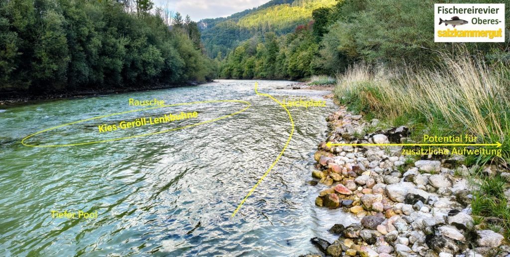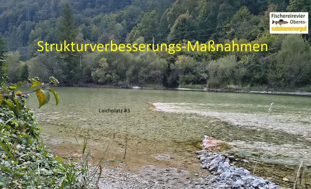 Laichplatzschüttung: Ev. Zugabe von Kies in der geeigneten Korngröße für die lokale Fischfauna zur kurzfristigen Schaffung von Laichplätzen. Wobei wie sich gezeigt hat, dass an der Oberen Traun zumeist die richtige Körnung unter einer Grobstein-Schicht vorhanden ist und nur durch einen zu geringen Gewässerquerschnitt und zu strakte Strömung, nur diese oben liegen bleiben. Bei unseren Laichplatzverbesserungsmaßnahmen konnten wir erste gute Erfahrung mit „Kies-Geröll-Lenkbuhne“ schaffen.