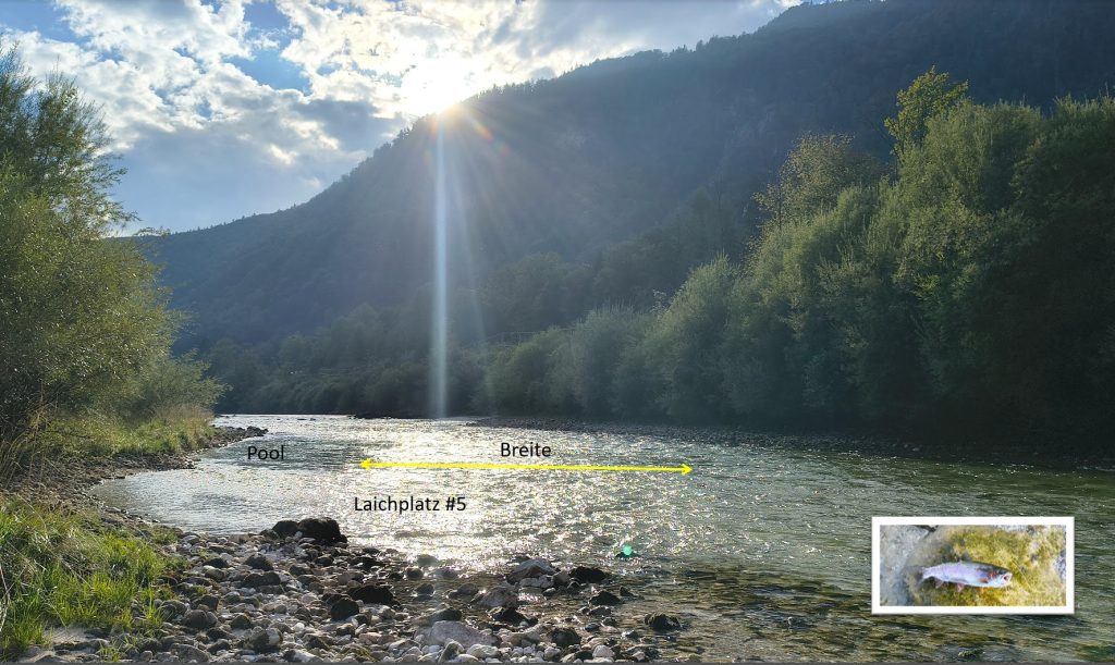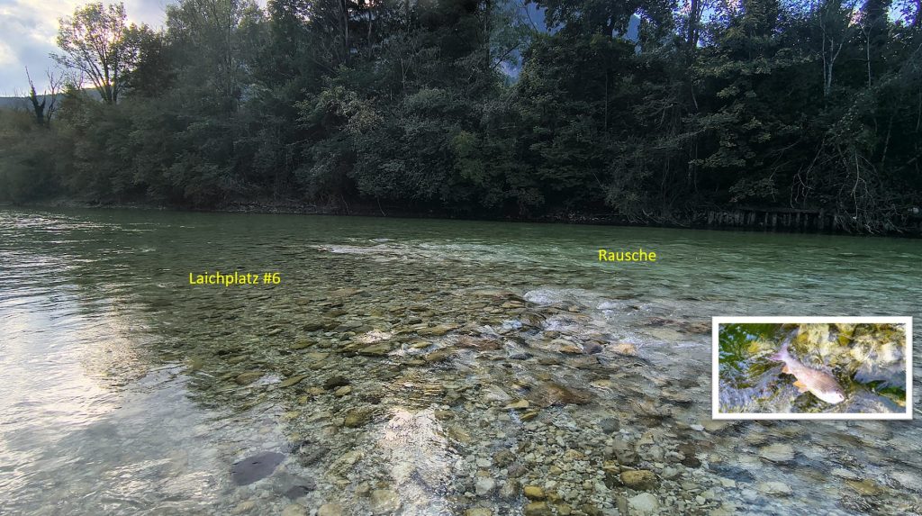 Bei dieser Laichplatzverbesserungsmaßnahmen wurde eine angelandete Schotterbank in die sehr rasch fließende Rausche geschoben. Dadurch wurde mehr breite geschaffen und der die starke Strömung entschärft bzw. eine Art „Kies-Geröll-Lenkbuhne“ geschaffen, die rechtsufrig ein Pool ausgewaschen hat im Pool-Auslauf hat sich ein schöner Laichplatz gebildet und zum linken Ufer hin ist eine sauerstoffreiche Rausche (Riffel) entstanden, der einen beliebter Sommer-Standplatz für Äschen bildet.