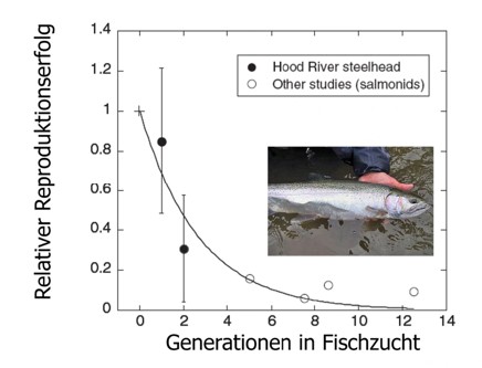 - Rasanter Fitnessverlust: Die Zucht in Gefangenschaft führt nach der Auswilderung zu einem raschen, genetisch bedingten Rückgang des Fortpflanzungserfolgs.