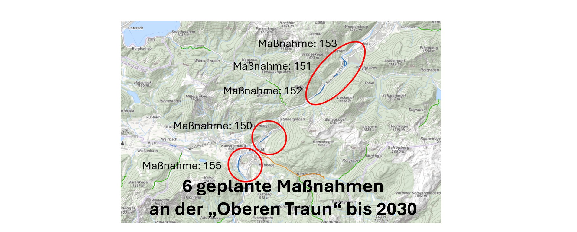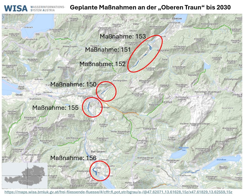 Basierend auf aktuellen Planungsunterlagen und den Zielen bis 2030 lassen sich sechs Maßnahmen konkret verorten. Diese konzentrieren sich vor allem auf den Abschnitt der „Oberen Traun“ zwischen Bad Goisern bis Ebensee.