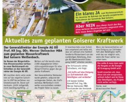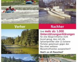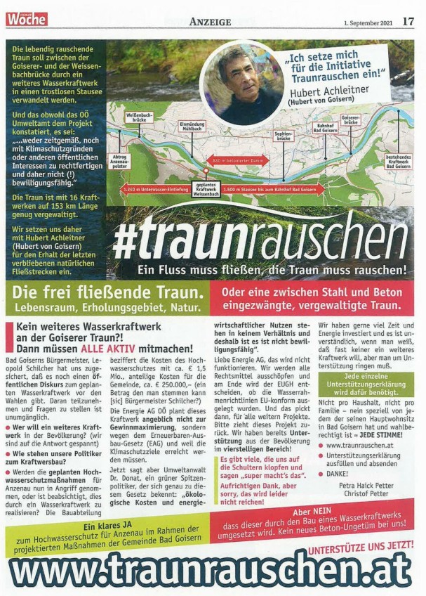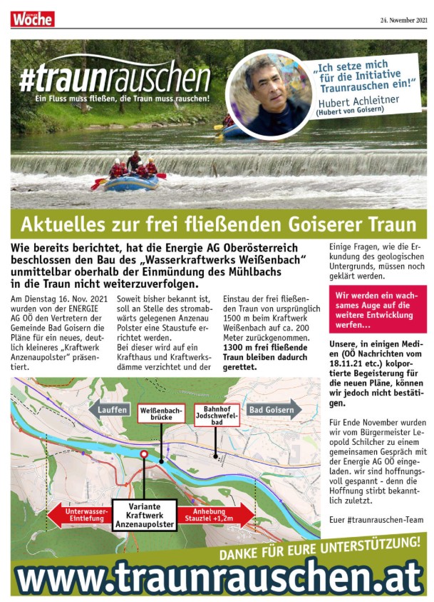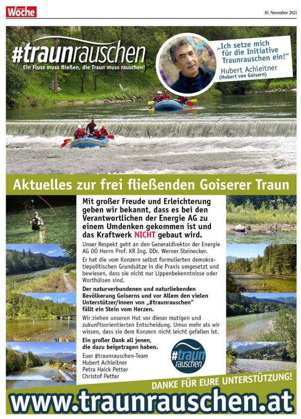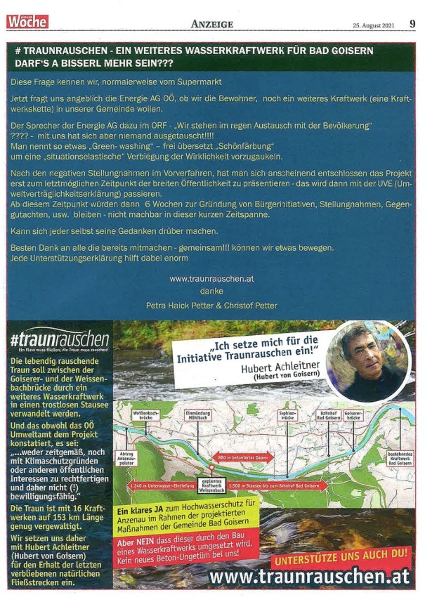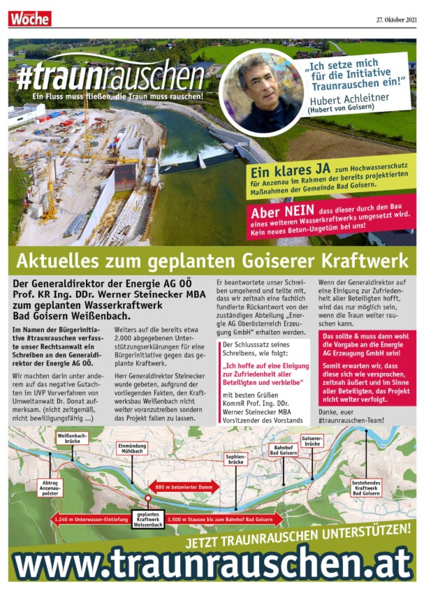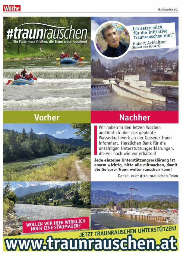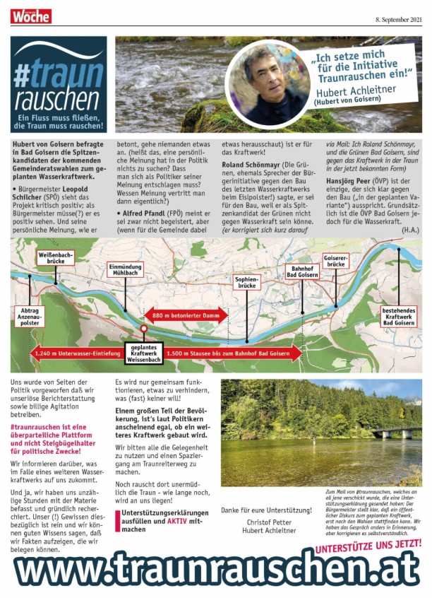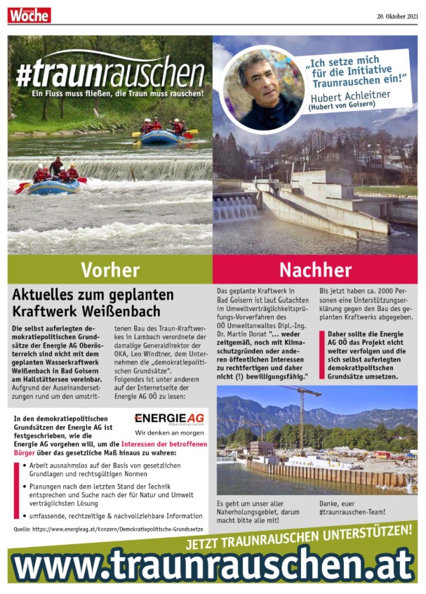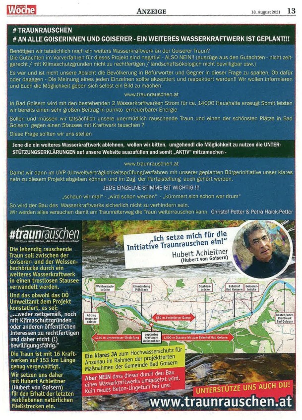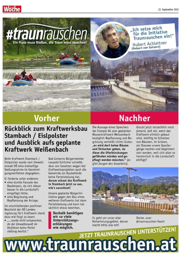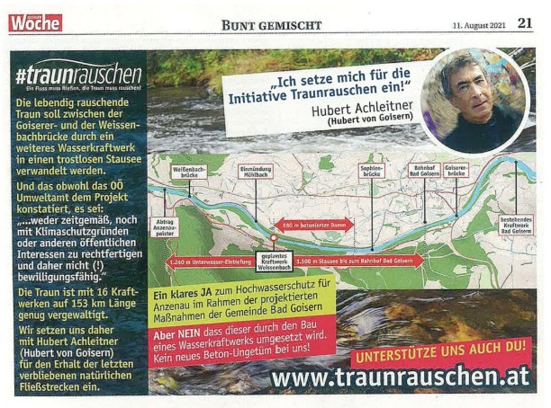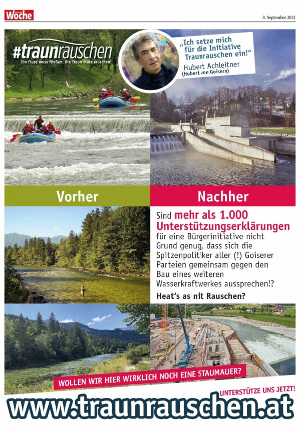 Wir setzten uns daher mit Hubert Achleitner (Hubert von Goisern) gemeinsam gegen den Bau des Kraftwerks ein und die Bürgerinitiative wurde durch eine Medien-Kampagne mit Inseraten Werbung in der lokalen Presse begleitet um die Bevölkerung zu informieren, sie dazu: