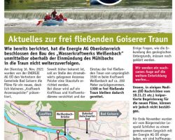 Die unermüdlich rauschende Traun soll zwischen Goiserer Brücke und Weissenbachbrücke in einen Stausee verwandelt werden und einem Wasserkraftwerk weichen. Dazu die Stellungnahmen des OÖ Umweltanwalt: